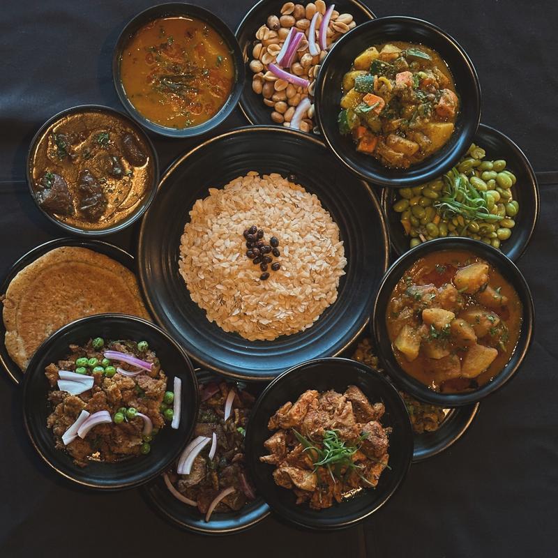 Big chunks of meat slowly braised in Newari broth mixed with Newari curry spices and cut into small pieces, served with side of chiura (Beaten Rice) or rice.